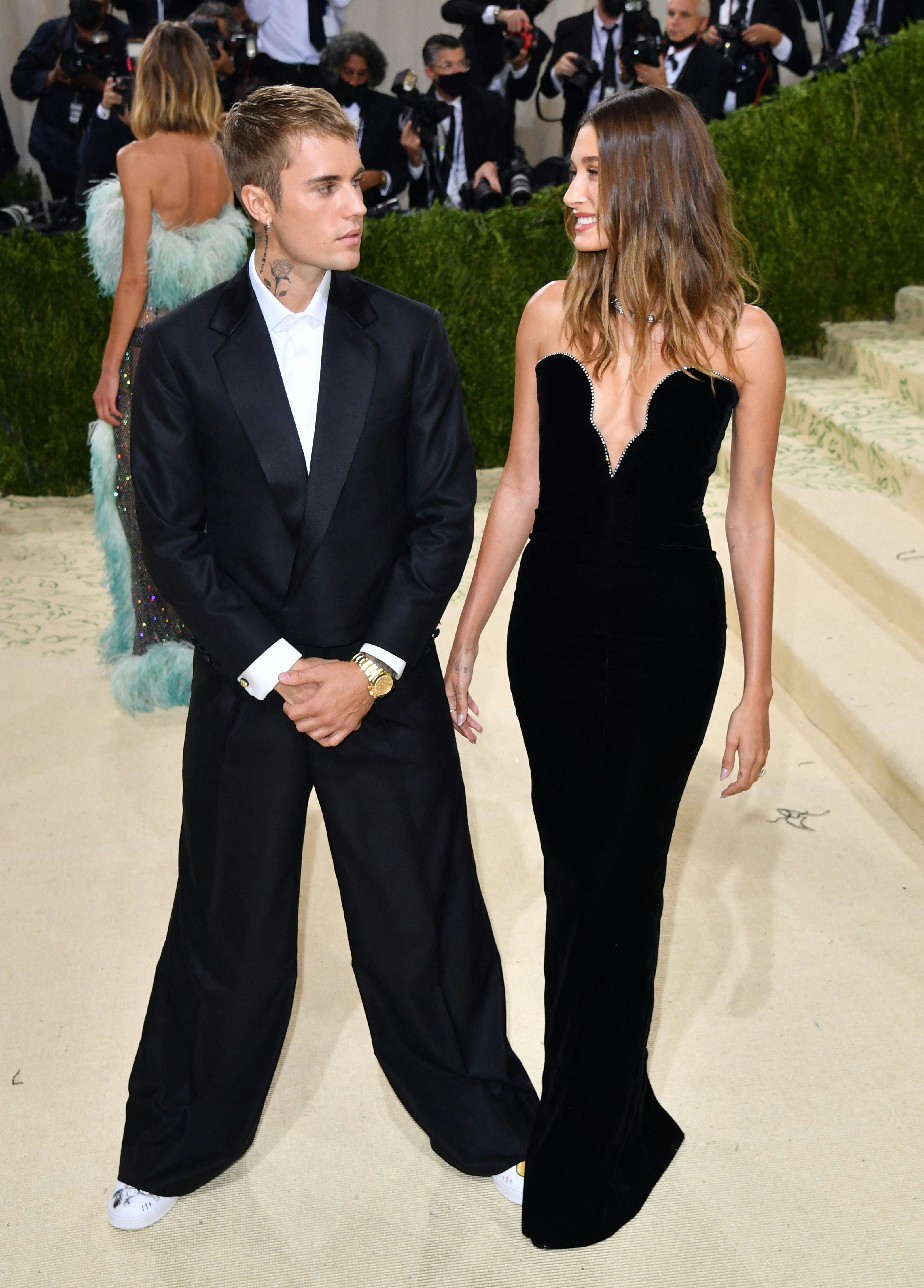 Hailey, who wore a Saint Laurent black strapless sheath gown with a plunging embellished neckline alongside a suited Bieber, was seen smiling at him as they arrived for the annual charity event before appearing to be visibly shaken after the apparent chanting.